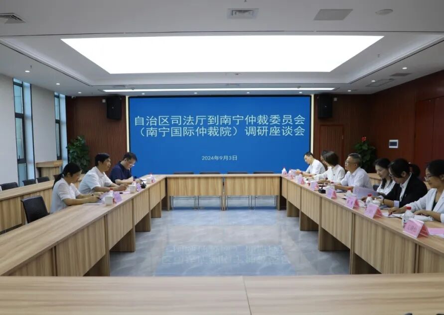 9月3日下午,自治区司法厅党委委员、副厅长梁和民在自治区司法厅公证和仲裁管理处、法律援助和司法鉴定处相关同志陪同下到南宁仲裁委员会(南宁国际仲裁院)开展调研工作。南宁仲裁委员会副主任兼秘书长蓝旭高,南宁仲裁委员会秘书处副秘书长刘冬冬、颜慧,以及南宁市司法局公共法律服务管理科和南宁仲裁委员会秘书处相关部门人员陪同调研。